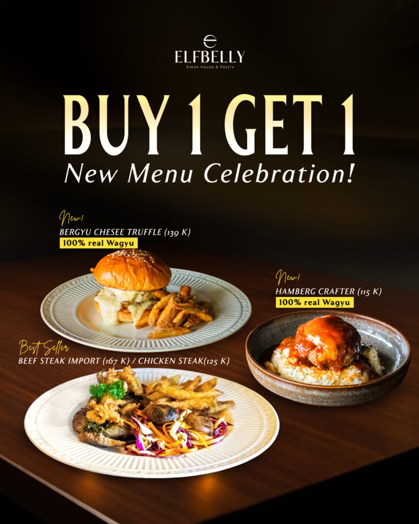 Elfbelly menghadirkan promo spesial untuk para pecinta steak. Nikmati Buy 1 Get 1 menu pilihan dengan kualitas daging terbaik.